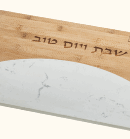 מגש חלה מהודר מעץ אמיתי בשילוב שיש אמיתי עם סכין לחלה ומיכל מובנה למלח