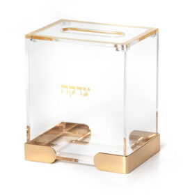 קופת צדקה מהודרת ומעוצבת אקרילי שקוף/מתכת זהב גובה 13 סמ