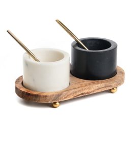זוג מלחיות פתוחות שיש וכפיות זהב על מגש עץ כהה 20/10 גובה 8 ס”מ