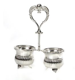 זוג מלחיות מתכת פתוחות /זכוכית שקופה ציפוי כסף פסים וידית נשיאה ציפוי כסף 5.3\12 ס”מ גובה 14.5 ס”מ