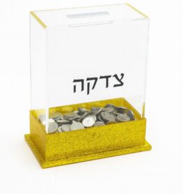 קופת צדקה מהודרת ומעוצבת אקרילי שקוף/מתכת זהב גובה 13 סמ
