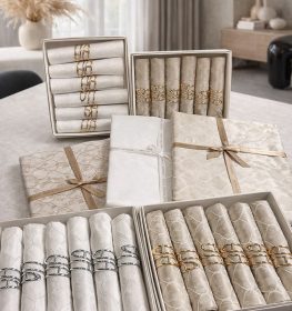 סט 6 מפיות תואמות + חבקים מעוצבים – לבן/שמנת/קפה- דגם תמר
