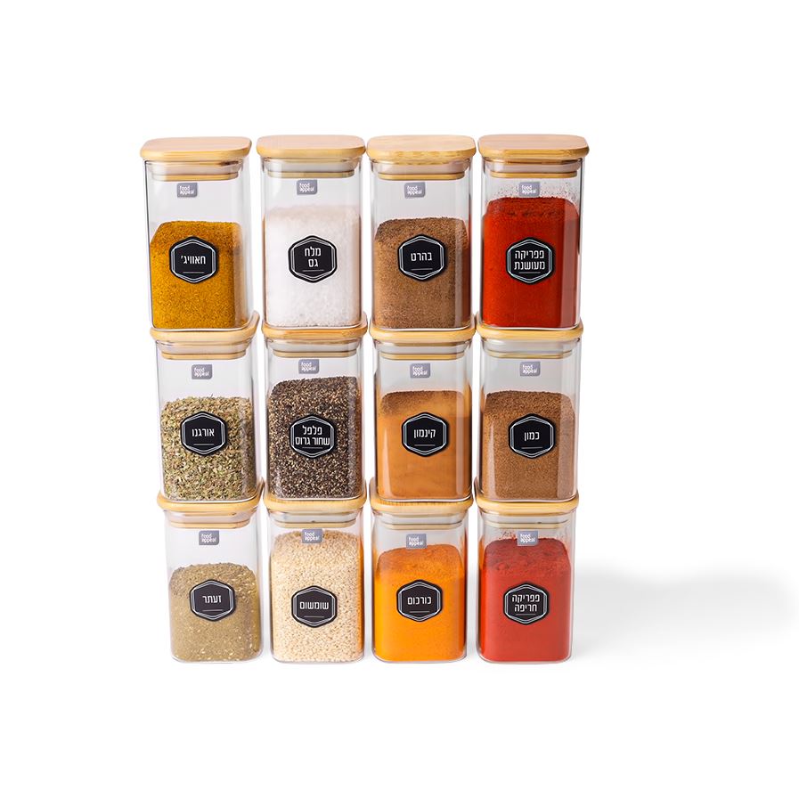 12 צנצנות זכוכית עגולות לתבלינים כולל מדבקות מבית המותג Food Appeal