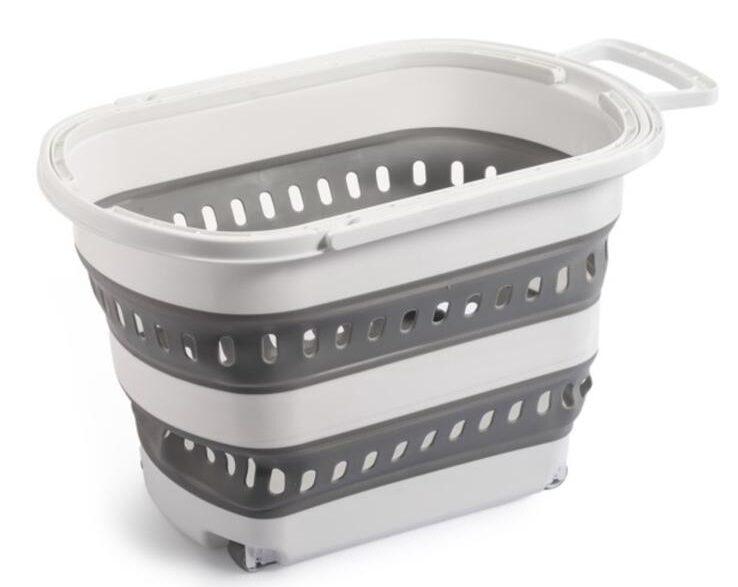 גיגית גדולה לכביסה עם גלגלים וידית אחיזה נוחה שמתקפלת .