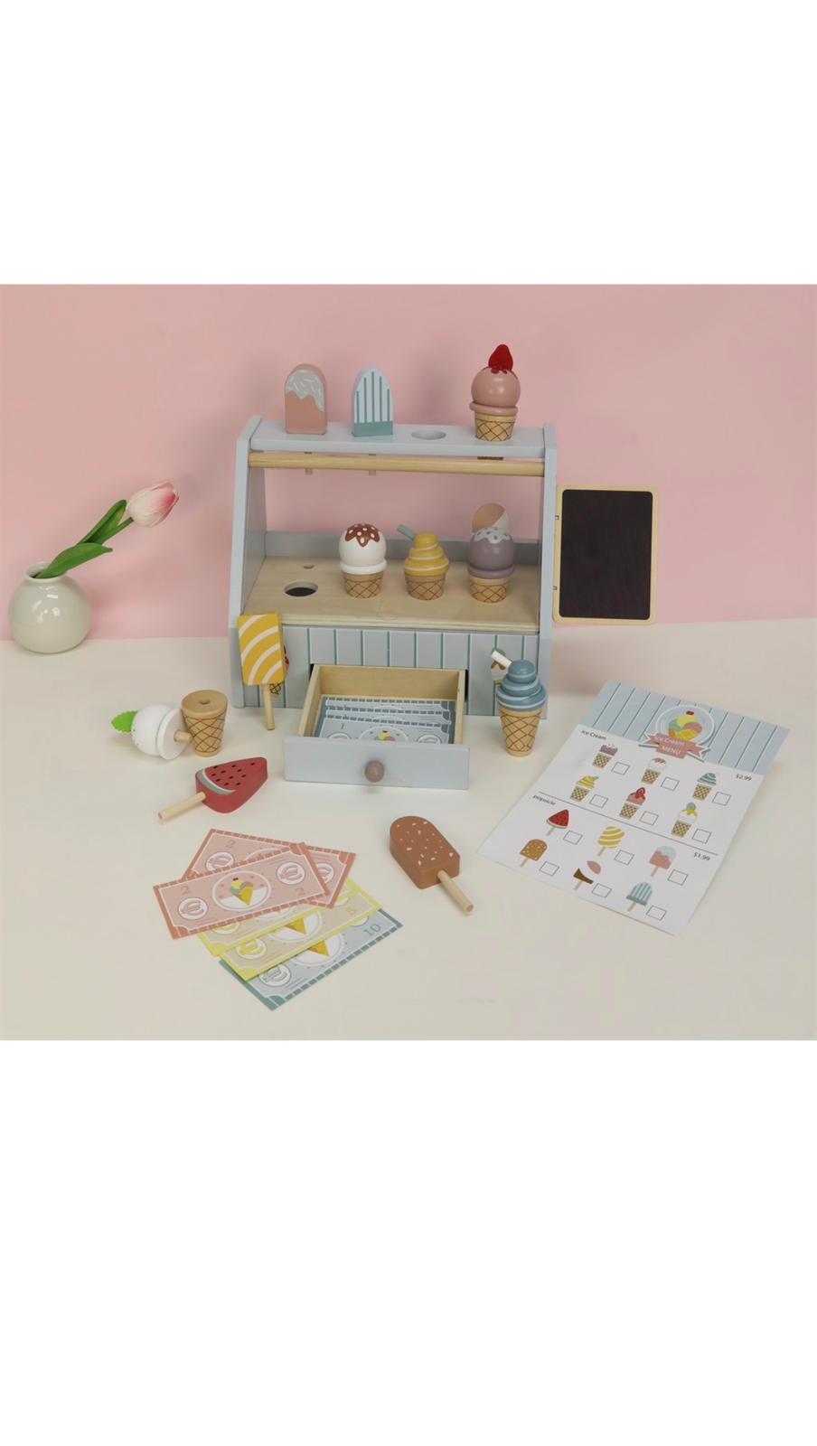 KABI משחקי עץ – מעמד לגלידות/ תפריט/ כסף/ מגירה/ לוח כתיבה/ גביעים/ גלידה/ ארטיקים)